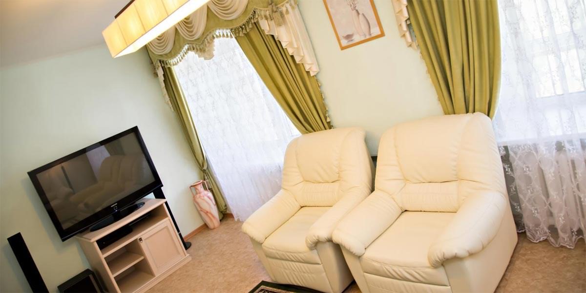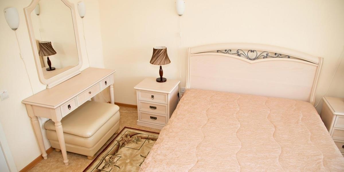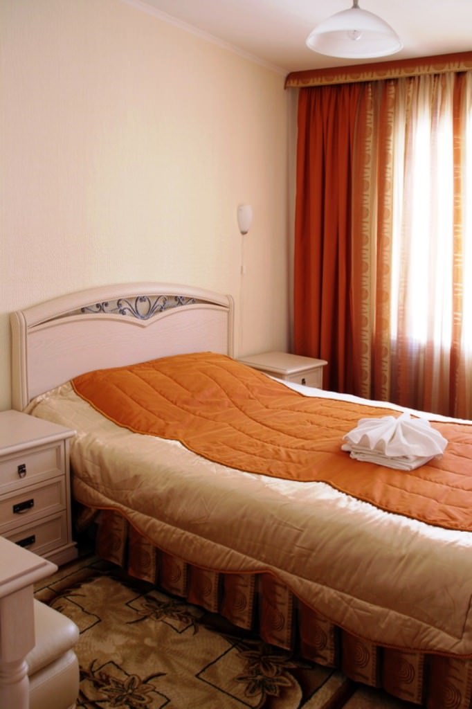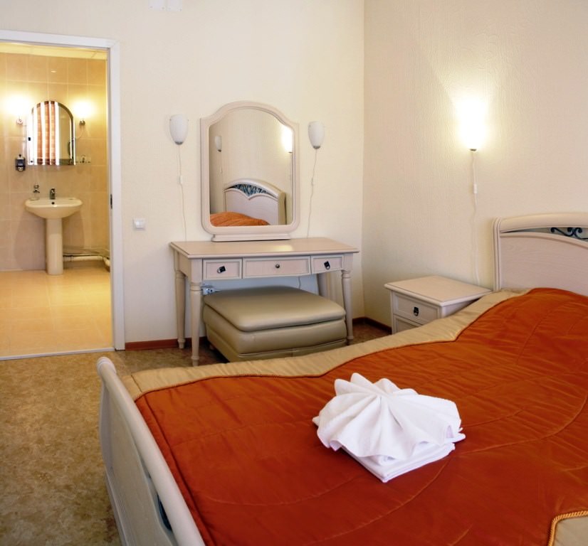 Площадь номера - 49 кв.м. 2 осн. места. 1 доп. место. Мебель: вешалка, диван, зеркало, кровать двуспальная, прикроватные тумбочки, стол, стулья, шкаф. Оборудование: телевизор, холодильник. Санузел: с душем, туалетные принадлежности. Сервис: Wi-Fi бесплатно, смена полотенец, смена постельного белья, уборка номера.