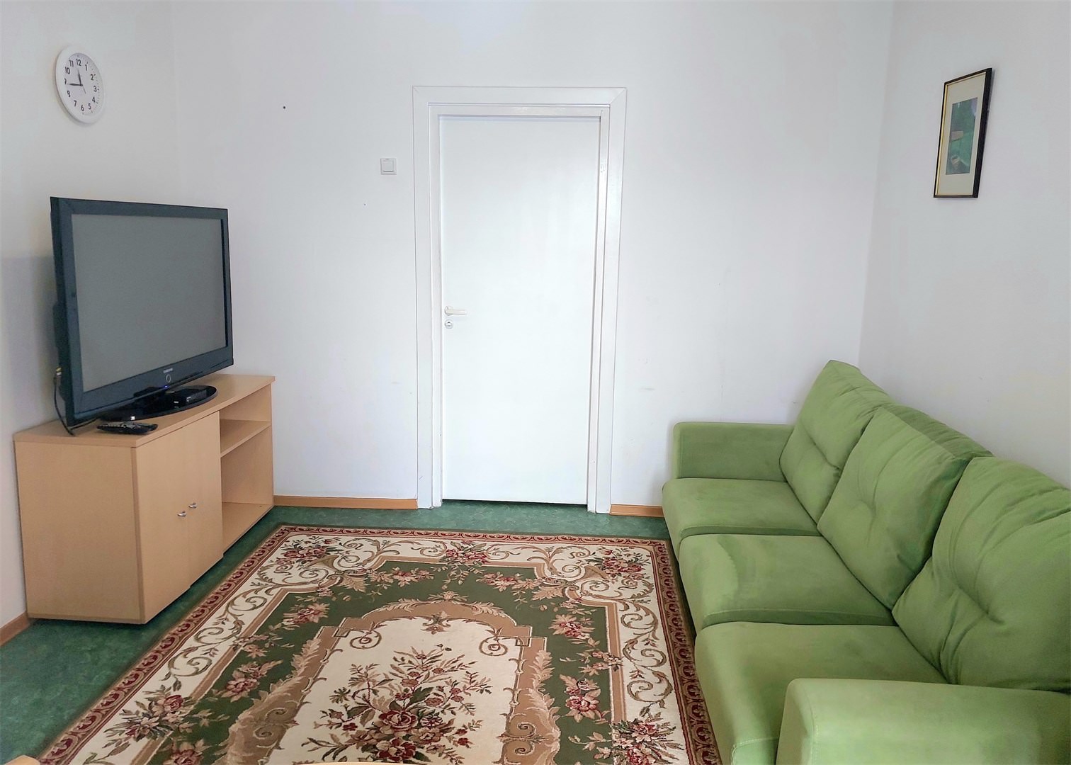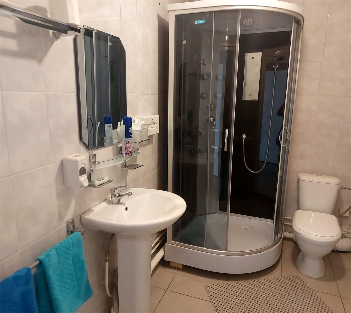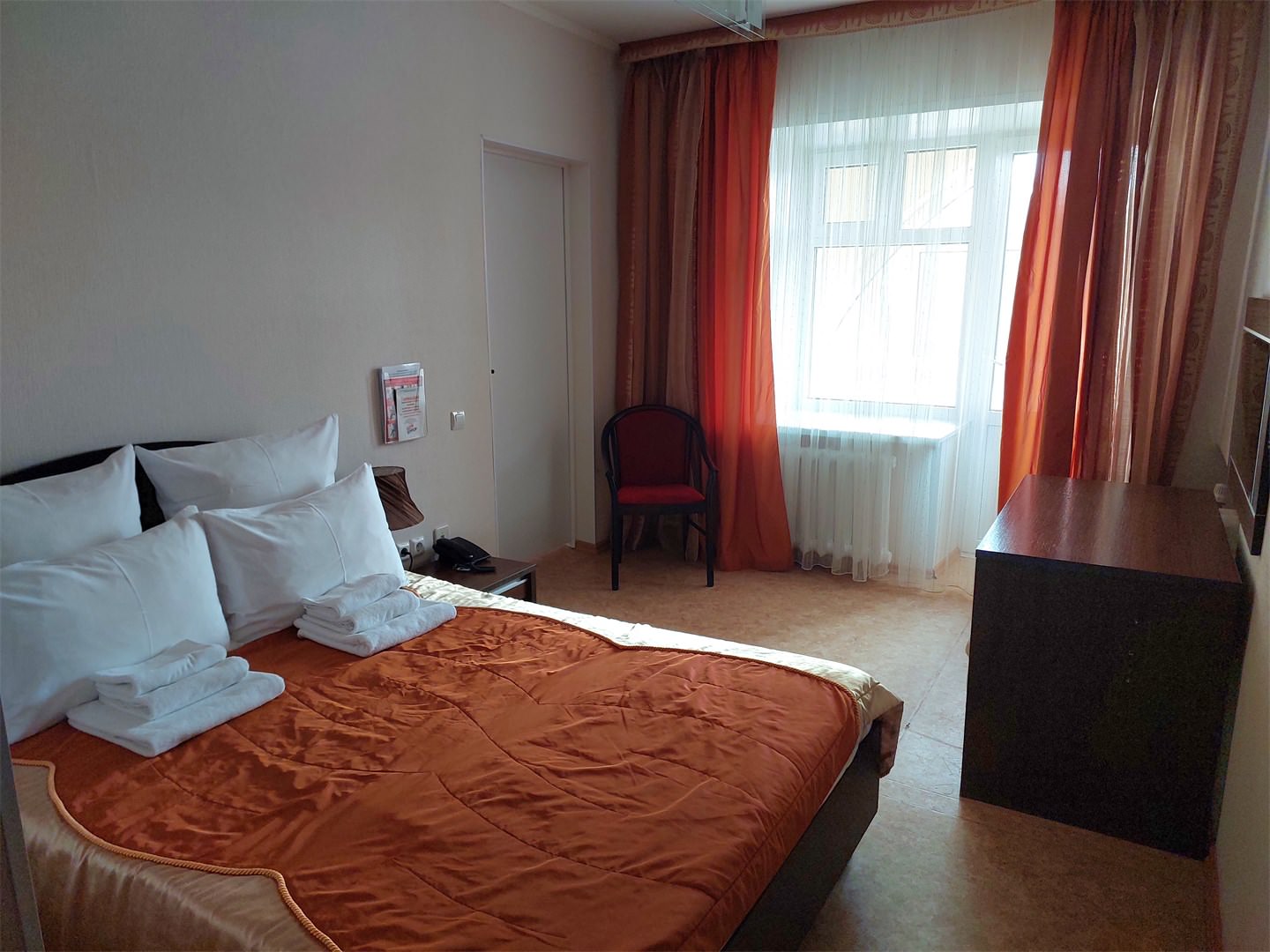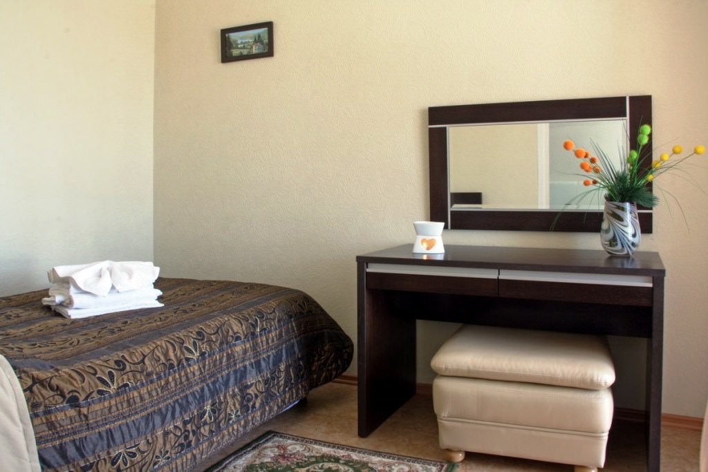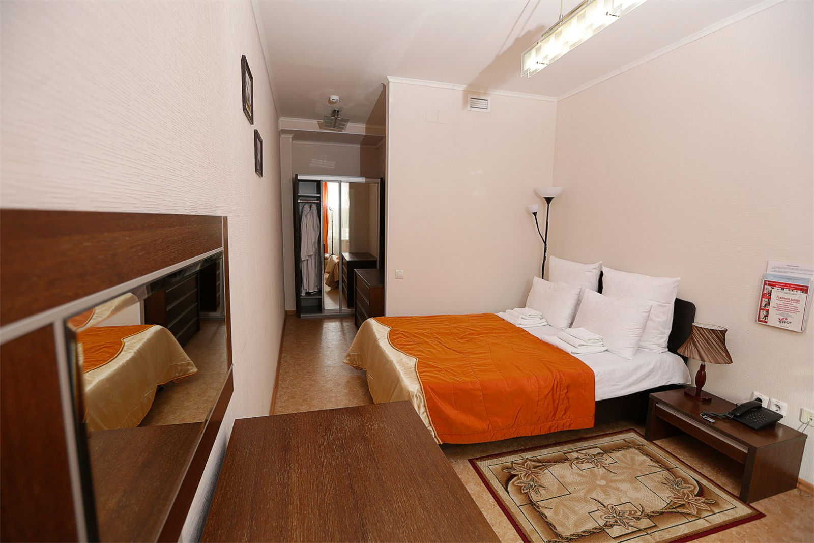 Площадь номера - 36 кв.м. 2 осн. места. 3 доп. места. Мебель: вешалка, диван, зеркало, кровать двуспальная, прикроватные тумбочки, стол, стулья, шкаф. Оборудование: телевизор, холодильник. Санузел: с душем, туалетные принадлежности. Сервис: Wi-Fi бесплатно, смена полотенец, смена постельного белья, уборка номера.